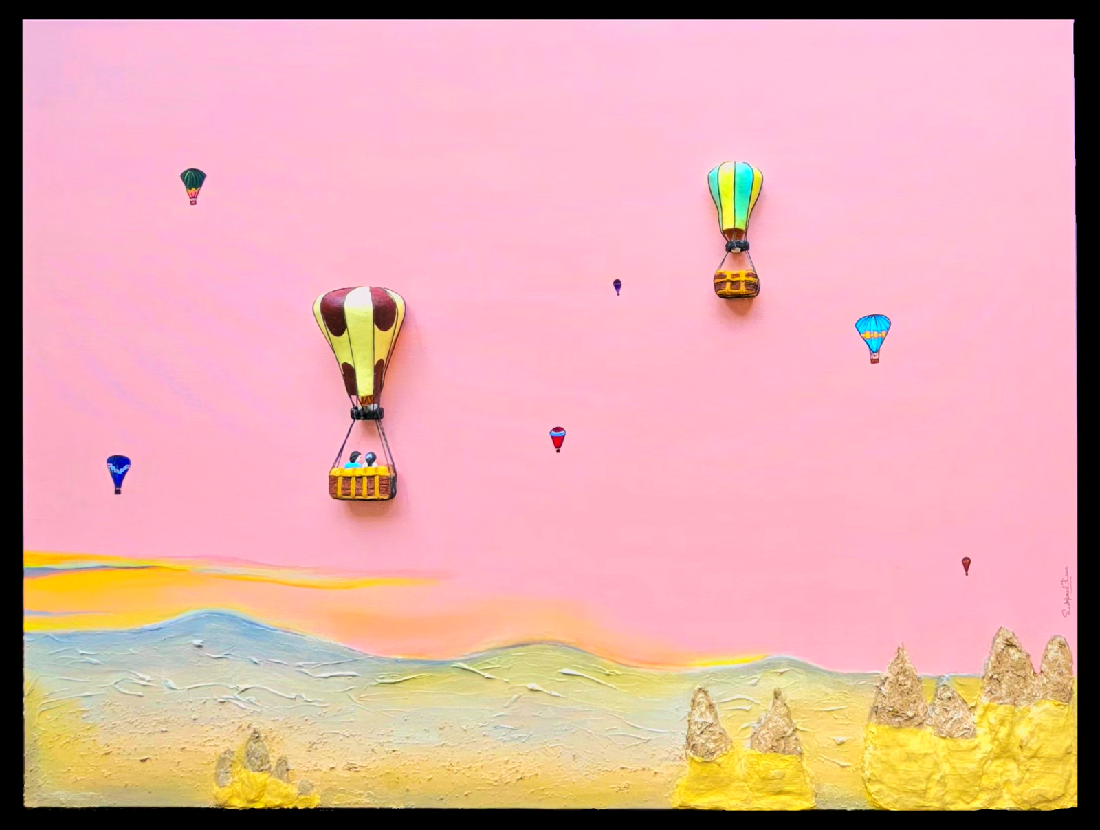 Inside the basket, one figure looks toward the distance while the other looks at their partner. It is a quiet detail, but it carries the heart of the piece.